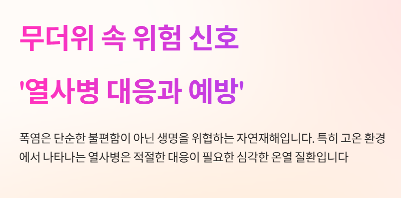 특히 열사병은 한 번 발병하면 후유증이 남거나 회복이 어려운 경우가 많아 예방이 최선의 대응입니다.