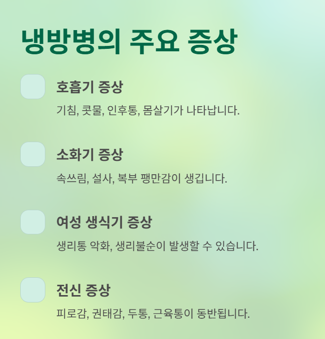 냉방병은 차가운 환경에 장시간 노출되면서 자율신경계가 불균형을 일으키는 증상입니다.