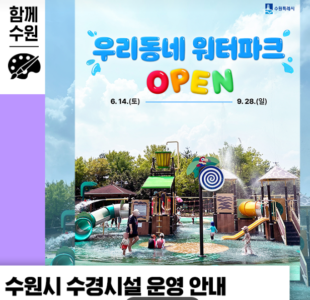 2025년 여름, 수원시 도시공원 내 수경시설이 6월 14일부터 본격 운영됩니다. 분수 시설은 9월 28일까지, 물놀이 시설은 7월 17일부터 8월 24일까지 운영되며, 일부 장소는 개장 일정이 다를 수 있습니다.