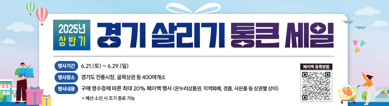 🛍️ 침체된 골목상권, 다시 살아납니다! 경기도가 6월 21일부터 29일까지 **‘2025 상반기 통 큰 세일’**을 전격 개최합니다. 최대 20% 페이백, 모바일 쿠폰, 경품까지! 올해는 예산도 100억 원으로 두 배 이상 확대🔥